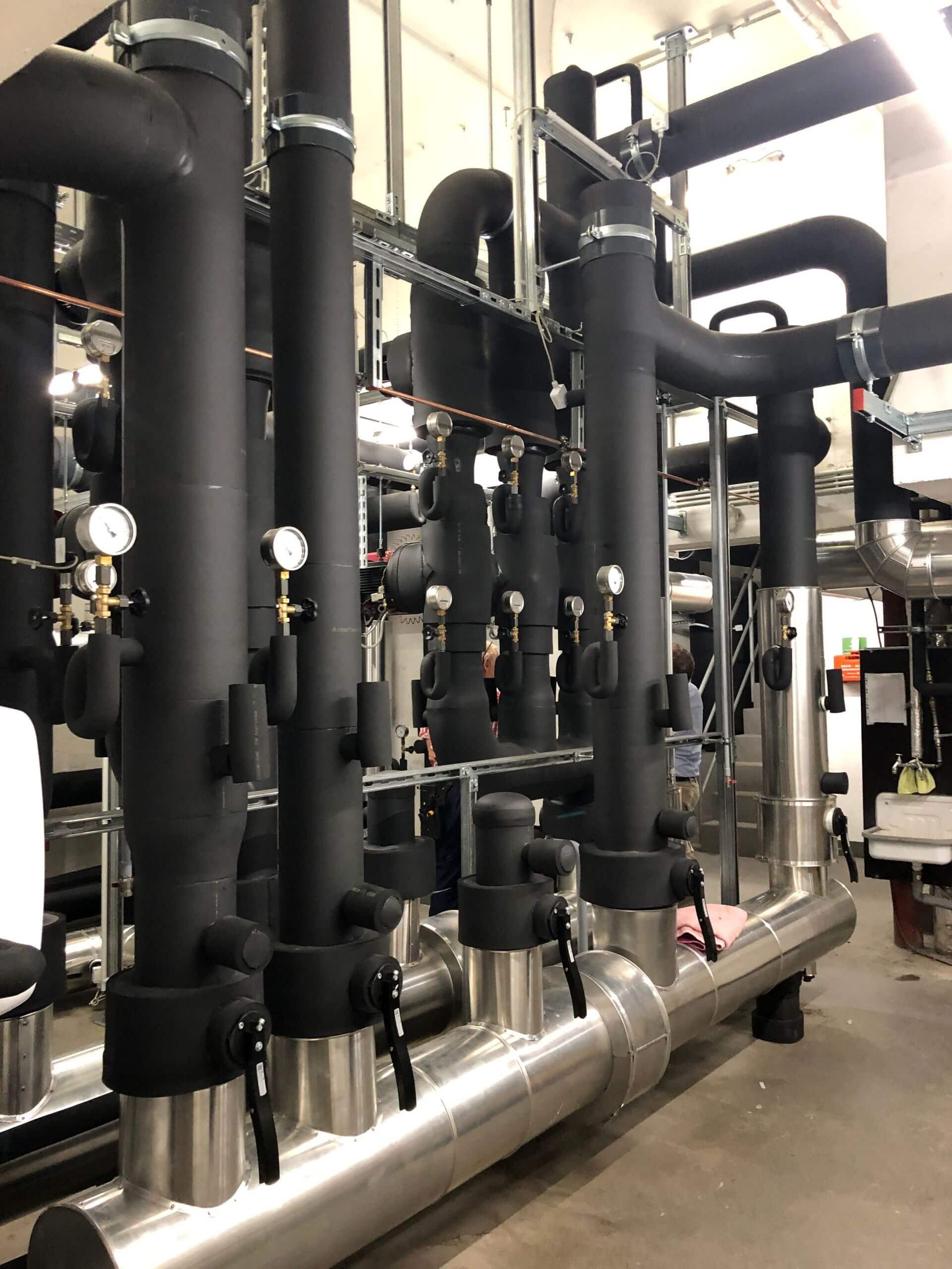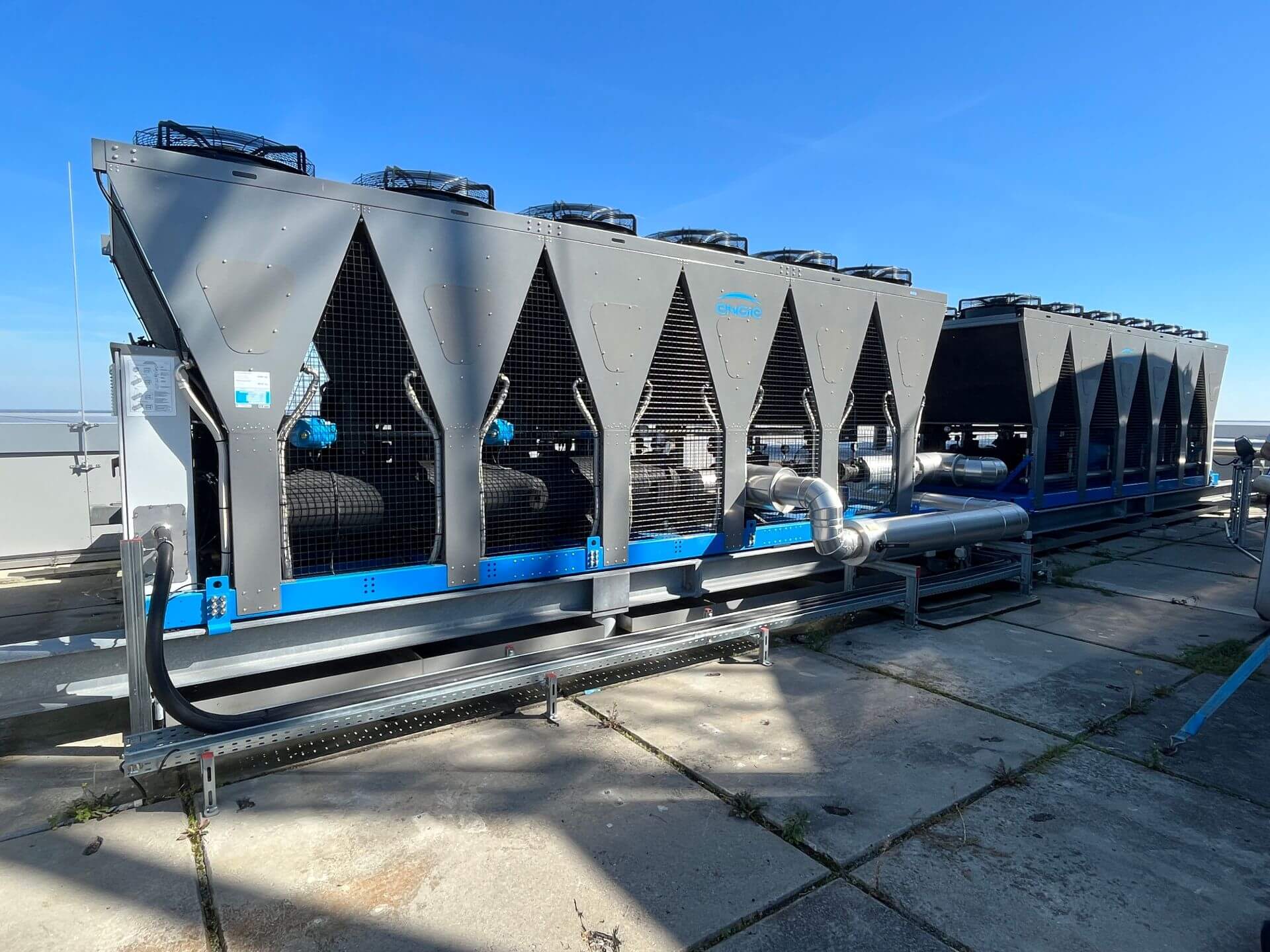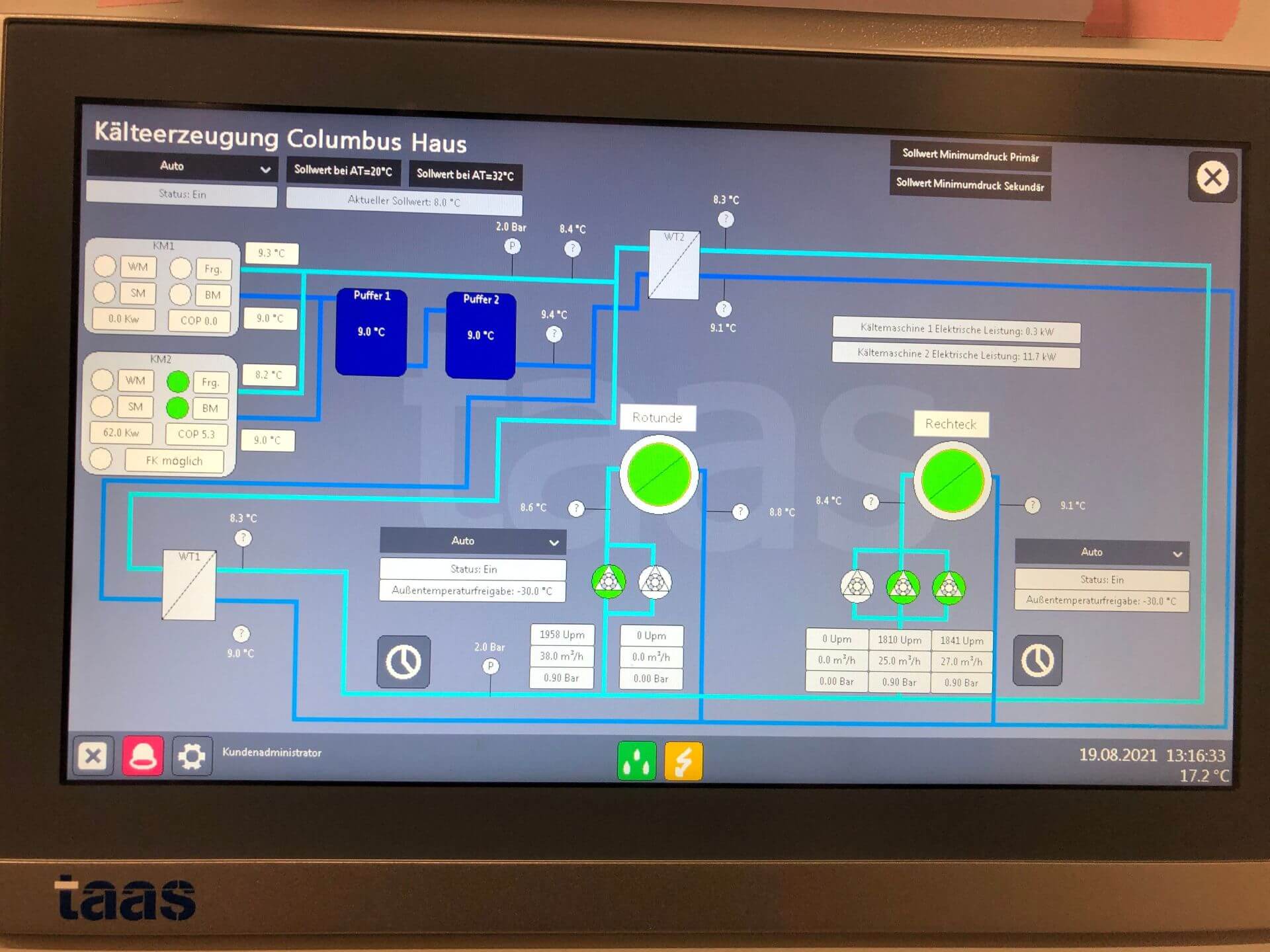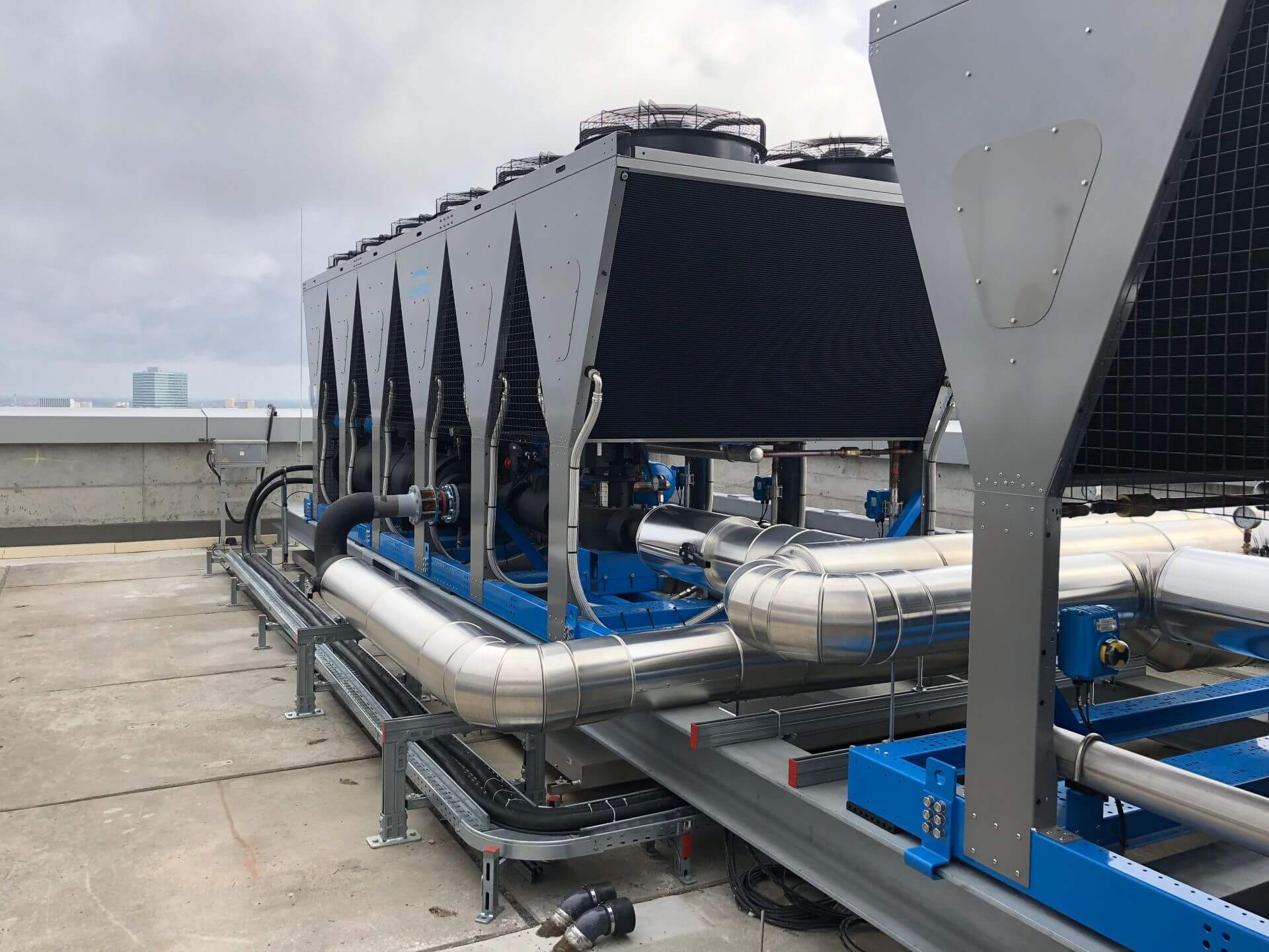 In dem 2002 errichteten und unter Denkmalschutz stehenden Gebäude können die vorhandenen Kältemaschinen aufgrund des hohen Instandhaltungs- und Instandsetzungsbedarfes nicht mehr wirtschaftlich betrieben werden. Zugleich fordern die Mieter zunehmend den Ausbau der Mietflächen mit Kühlfunktion. KLIMAHAUS erstellte das Konzept für eine neue zentrale Kälteerzeugung auf dem Dach über dem 22. OG sowie die Strangverrohrung aller 22 Geschosse einschl. des Riegelbaus. Zudem wurde KLIMAHAUS mit den Mieterausbauten 3., 4. und 5. OG beauftragt. Das Gebäude verfügt nun über zwei hocheffiziente luftgekühlte Kältemaschinen mit Freikühloption, die auch die EDV-Wärme ganzjährig